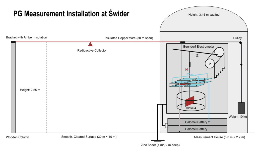 Photo and diagrams installation of the measurement of the atmospheric electric potential gradient at Świder 1929-1939 (for more details and photo information see Odzimek 2026).